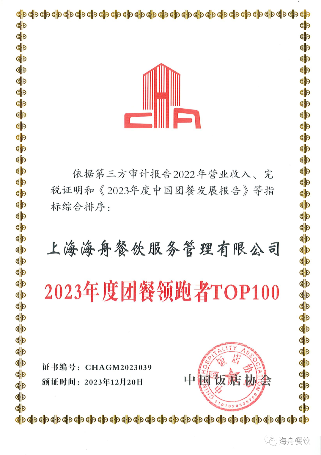 我司获评“2023年度团餐领跑者TOP100” | 动态新(xīn)闻 | 行业洞见 | 上海海舟餐饮服務(wù)管理(lǐ)有(yǒu)限公司